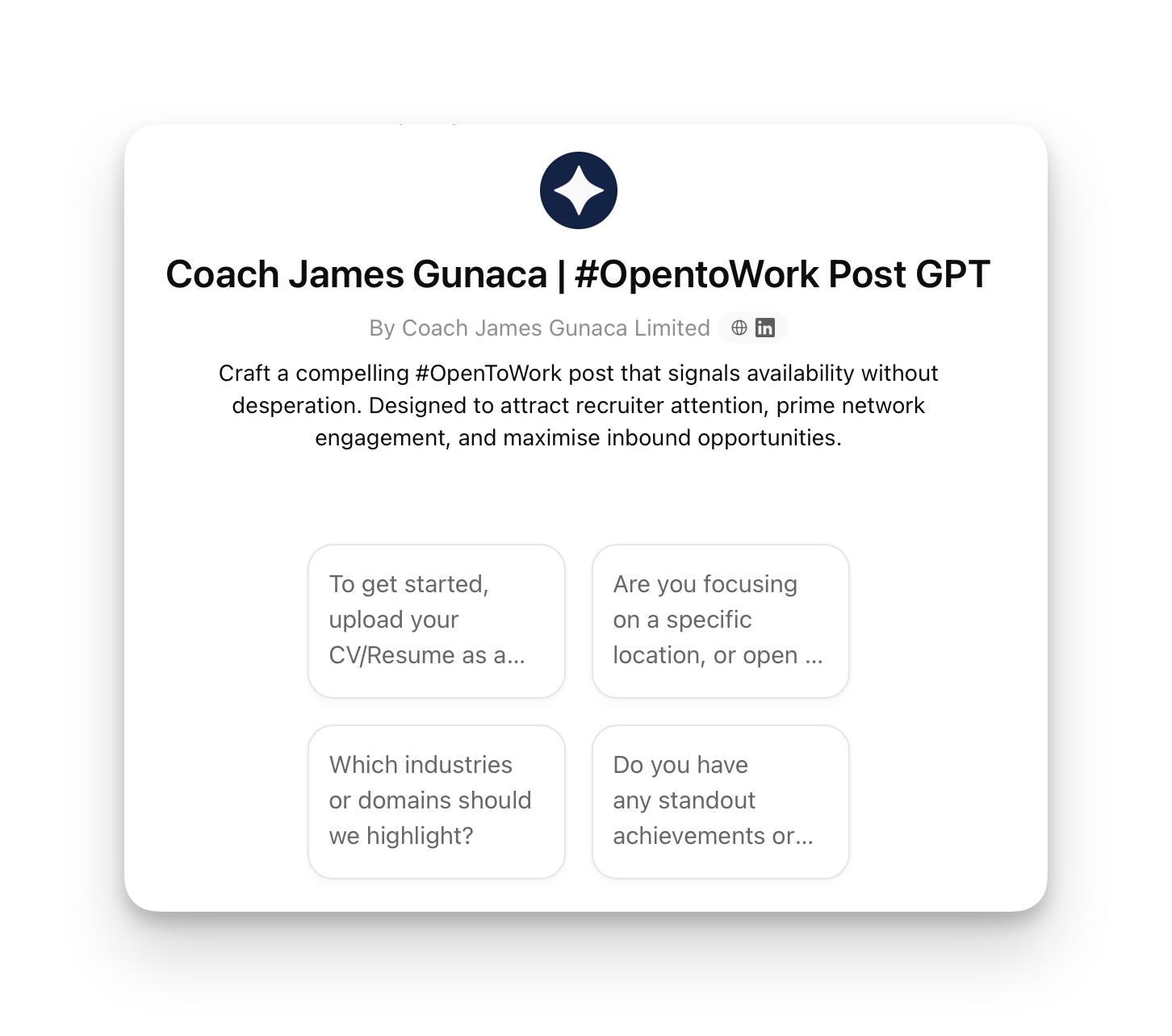 Announcing your job search shouldn't feel desperate. Use my custom GPT to get a ready-to-post LinkedIn update that signals availability with confidence — designed to attract recruiters, activate your network, and maximise inbound opportunities.
