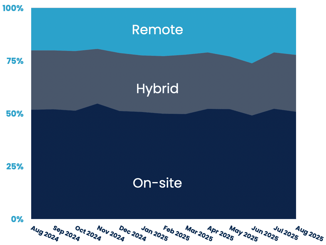 Work environments continue to evolve with on-site positions still dominating, hybrid arrangements stabilising, and remote opportunities ticking back up after last month’s steep decline.