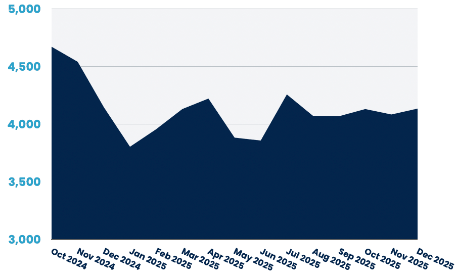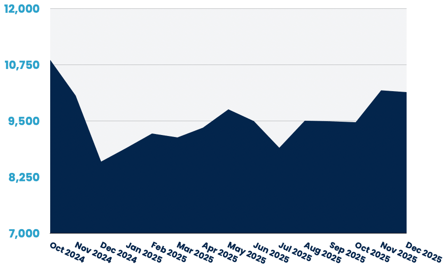 The US market maintained its position with 10,138 PM jobs, essentially flat at -0.4% from November. After a strong November showing (+7.5%), this stabilisation is expected heading into the holiday season. Year-over-year growth remains solid at 18%.