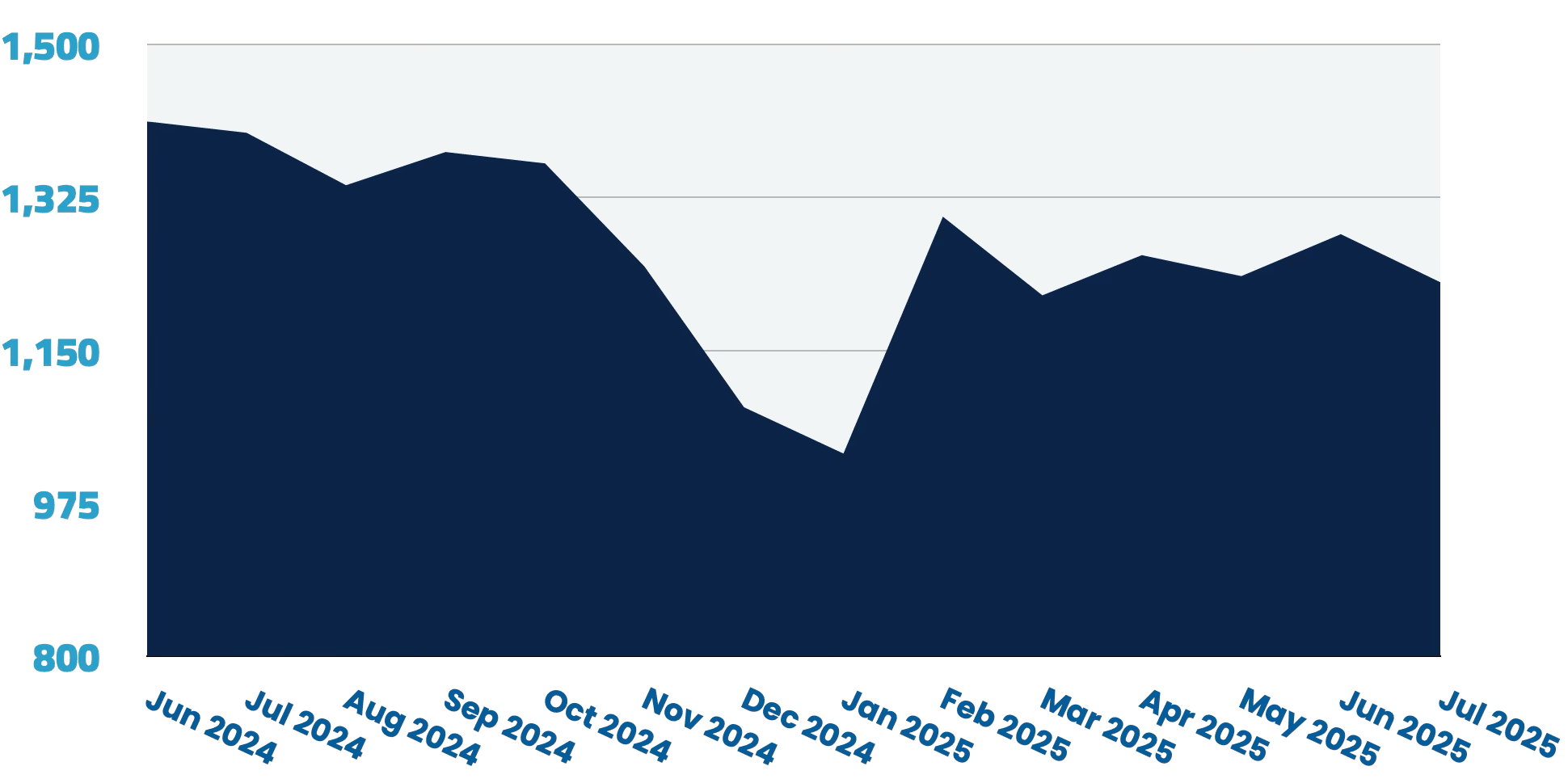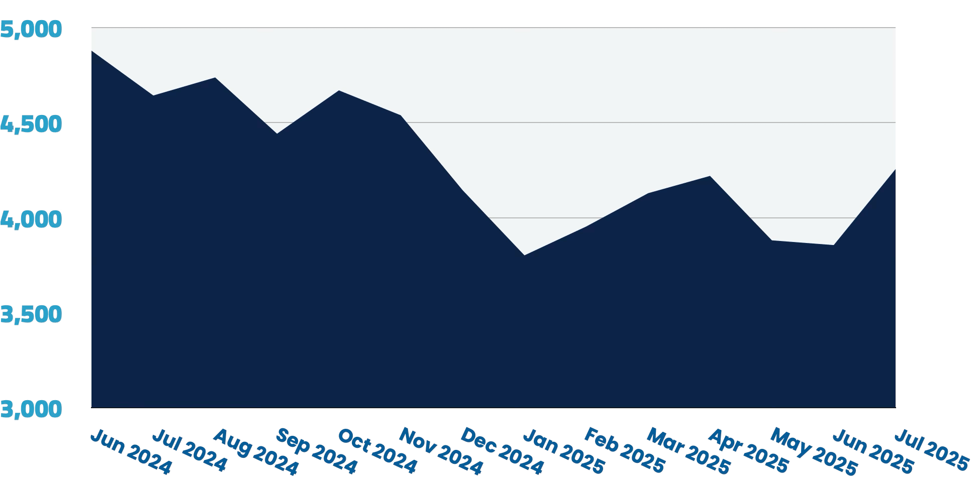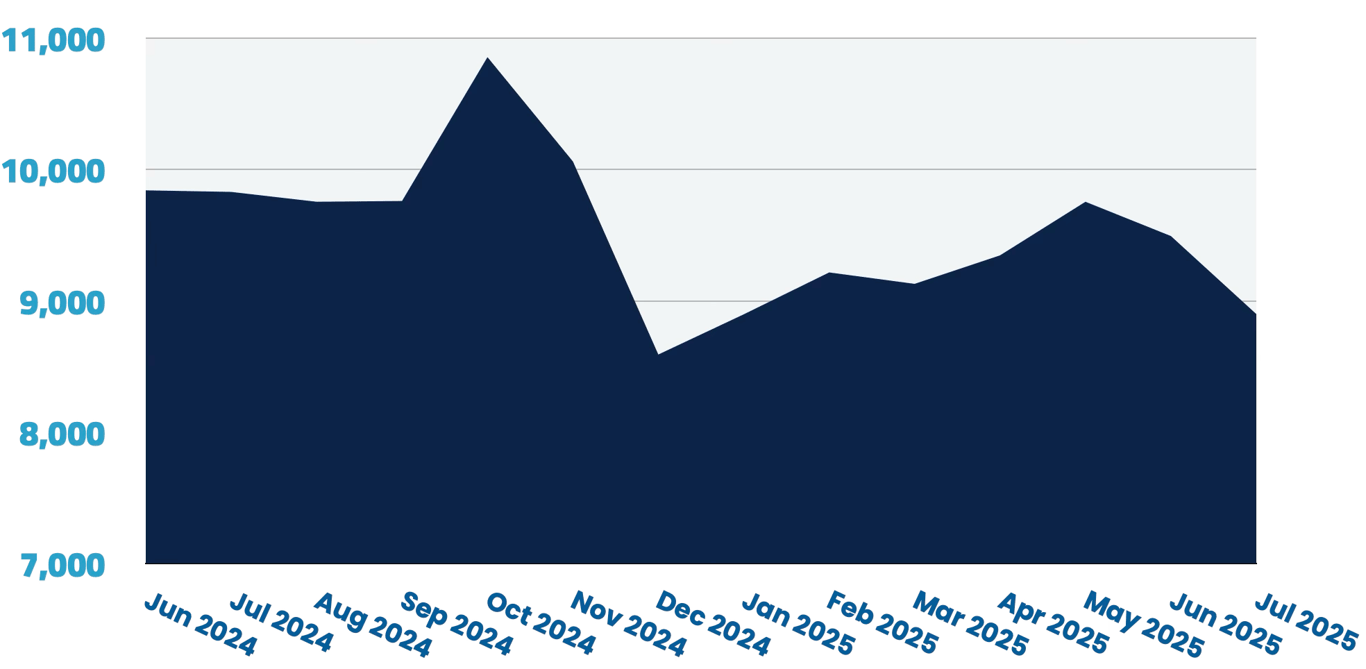 Mid-level positions continue to dominate the market with 16,788 opportunities available. While these roles represent a substantial 66.3% of the total market, they’ve experienced a notable 5.6% month-over-month decline, translating to 990 fewer positions than in June.