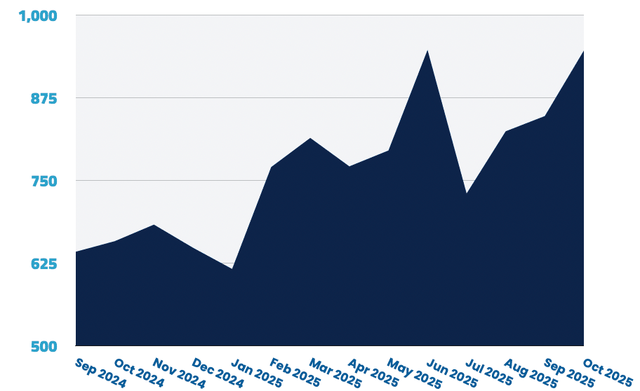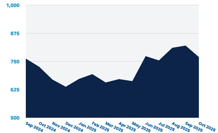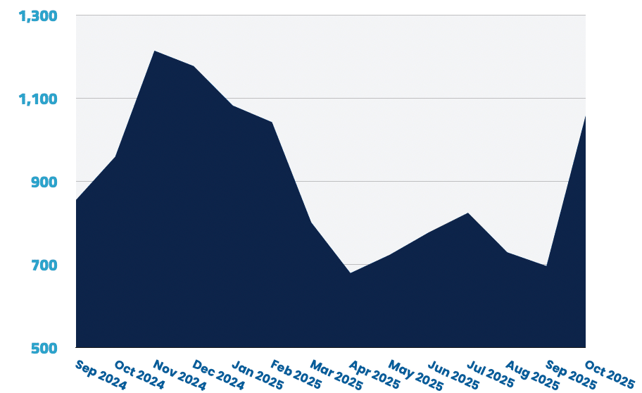 Canada fell to 769 jobs (–6.2%) after September's modest growth. Associate roles surged 50% while senior positions declined sharply (–23%), creating divergent opportunities by seniority.