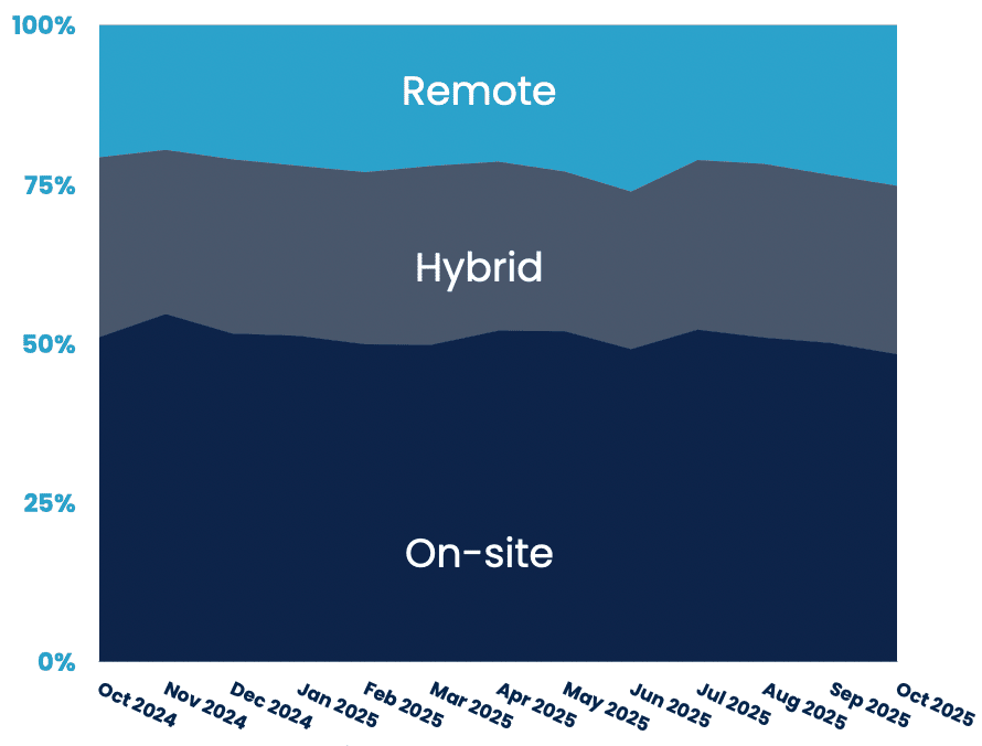 Hybrid work jumped 7% while remote fell slightly (–1.3%). The market remains 12% below last year, suggesting ongoing recovery challenges.