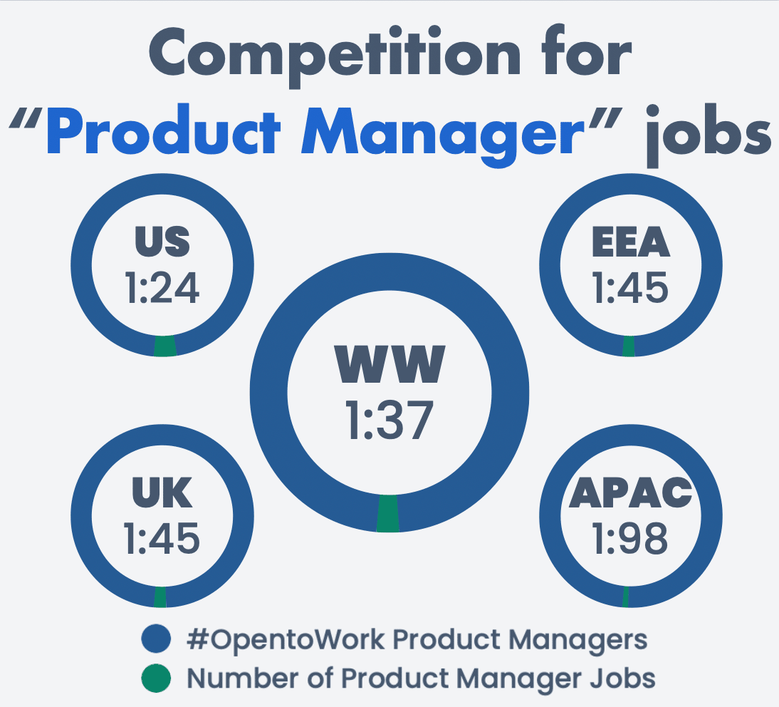 In total, I found that there is 1 product manager job for every 37 product managers seeking work.