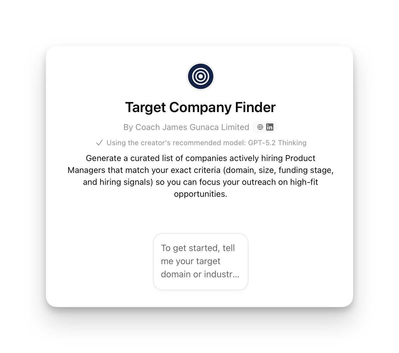 Stop wasting time on random job boards. This GPT finds companies that actually hire PMs matching your criteria. Domain, size, funding stage, location—whatever matters to you. Get a curated list with hiring signals, summaries, and direct links to find the right fit.